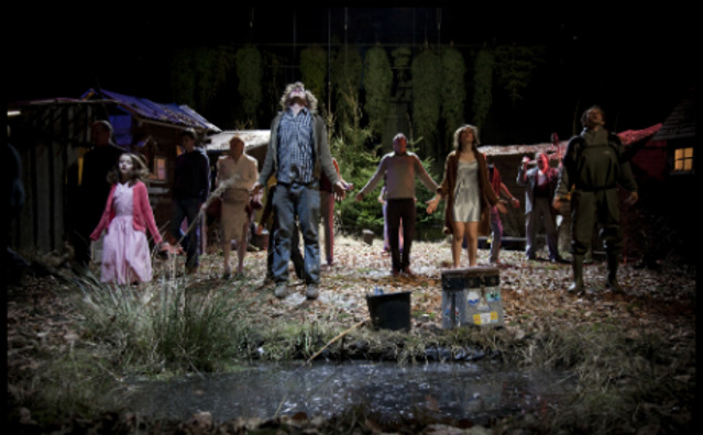 Ένα μικρό χωριό έχει στηθεί στη σκηνή. Πίσω του, προβάλλει ένα δάσος. Η μυρωδιά από το βρεγμένο χώμα και τα πεσμένα φύλλα τρυπάει τα ρουθούνια μας. Στο προσκήνιο, κάποιος ψαρεύει σε μια θολή λίμνη. Επικρατεί μια ατμόσφαιρα ανησυχίας. Ξαφνικά, ένας κάμεραμαν τρυπώνει στα έξι ξύλινα καλυβάκια. Θα προβάλλει σε γιγαντοοθόνες τα όσα παρανοϊκά εκτυλίσσονται εκεί. Η μικρή κοινότητα γευματίζει, γλεντά, ερωτοτροπεί, αυνανίζεται, φτάνει στα όρια της ψύχωσης: ένας υπερρεαλιστικός μικρόκοσμος, απ’ όπου κανείς δεν μπορεί να ξεφύγει.