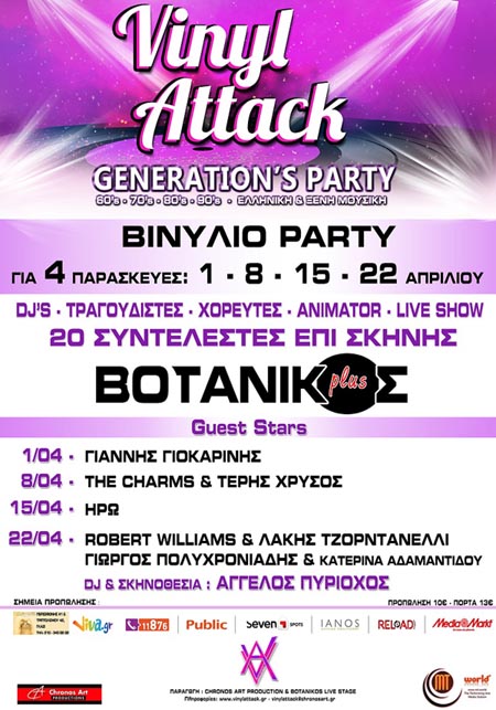 Το “V I N Y L A T T A C K - G E N E R A T I O N’S P A R T Y ” μπλέκει με μοναδικό τρόπο την νέα γενιά τραγουδιστών, χορευτών με τους αντίστοιχους Star’s του τότε και του σήμερα και το αποτέλεσμά… είναι απλά μαγικό.
