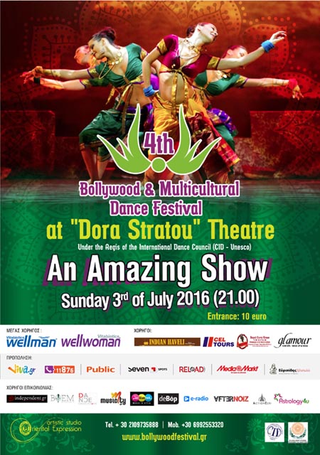Με μια μοναδική χορευτική παράσταση στο Θέατρο Δόρα Στράτου (Κυριακή 3 Ιουλίου 2016) κορυφώνεται η φετινή διοργάνωση του 4oυ Φεστιβάλ Bollywood και Πολυπολιτισμικών Χορών στην Ελλάδα.