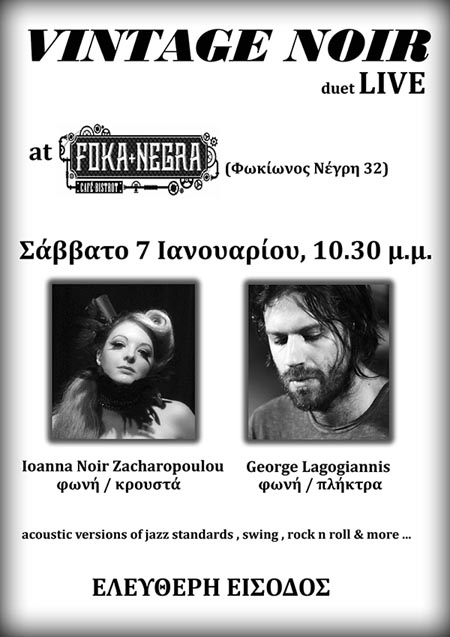 Οι Vintage Noir (duet) επιστρέφουν στο Foka Negra café-bistrot (Φωκίωνος Νέγρη 32, Κυψέλη) , το Σάββατο 7 Ιανουαρίου , στις 10.30 το βράδυ , για ένα ρετρό jazz live με ελεύθερη είσοδο.
