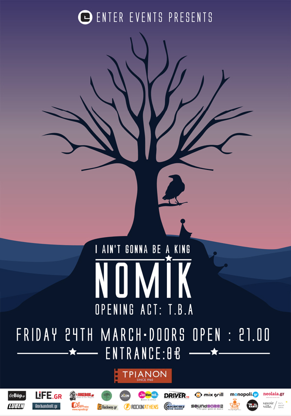 Την Παρασκευή 24 Μαρτίου στο Cine Τριανόν ο Nomik frontman του σπουδαίου ελληνικού psych Rock συγκροτήματος Sleepin Pillow και παλαιότερα των Universal Trilogy θα παρουσιάσει στο κοινό για πρώτη φορά το debut solo album του με τίτλο “I Ain’t Gonna Be A King”, που κυκλοφόρησε στις 3 Μαρτίου. Θα απολαύσετε έναν εντελώς διαφορετικό Nomik σε σχέση με τις άλλες live εμφανίσεις του, με τη συνοδεία live μπάντας να συμπληρώνει ιδανικά τη performance!
