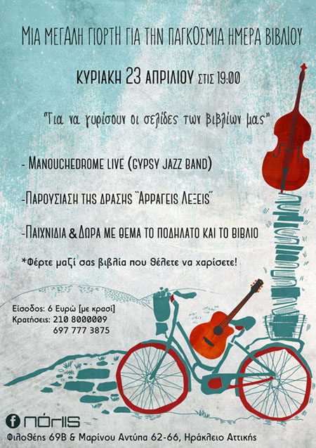 Την Κυριακή 24 Απριλίου, το βιβλίο, η μουσική και το ποδήλατο συναντώνται με τρόπο αφηγηματικό σε μια ξεχωριστή γιορτή. Το Πόλις συνεχίζει τις πρωτότυπες και πολυσυλλεκτικές του δράσεις και αυτήν τη φορά σας προσκαλεί να έρθετε με βιβλία που δεν χρειάζεστε, να τα χαρίσετε κι έτσι να γίνετε μέρος αυτής της γιορτής.