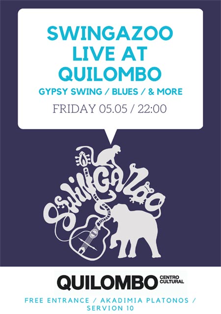 Γύρω στο 2010, η 4μελής παρέα των Swingazoo άρχισε να ανακατεύει με μπόλικη αυτοσχεδιαστική διάθεση τις συνθέσεις του Django Reinhardt με τα blues, και τα jazz standards με το ορμητικό groove της gypsy swing. Πλέον, με πλήθος ζωντανών εμφανίσεων στις αποσκευές τους και με την παρέα να έχει μεγαλώσει, κάνουν την επόμενη στάση τους - για πρώτη φορά - στο φιλόξενο χώρο του Quilombo, όπου θα παρουσιάσουν το πρόγραμμα τους και θα αυτοσχεδιάσουν, χτυπώντας ρυθμικά το πόδι και προ(σ)καλώντας τους ενδιαφερόμενους σε μια ανοιξιάτικη βραδιά γεμάτη μουσική και σωματική δράση!