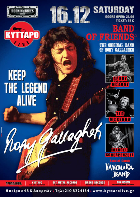 και στο ΚYTTAΡΟ,το Σάββατο 16 Δεκεμβρίου οι μυθικοί VAVOURA BAND με την εκπληκτική σκηνική τους παρουσία και την ιδιαίτερη σχέση με τον Rory καθώς ο Τζώννυ Βαβούρας ήταν ενεργό μέλος της παραγωγής του αξέχαστου live της Νέας Φιλαδέλφειας το 81 οπού μαζί με τον Γιάννη Δρόλαπα, έζησαν ιστορικές στιγμές παρέα με τον Rory και τον Gerry McAvoy!!! O Γιάννης Δρόλαπας (Vavoura Band / Μουσικές Ταξιαρχίες) μάλιστα, έγραψε αργότερα ένα φανταστικό ομώνυμο tribute κομμάτι για τον Rory!!!!!!!!!!!!
