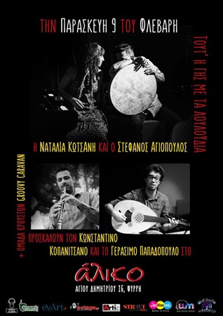 Μια παράσταση πολύχρωμη και γιορτινή, όπου ανταμώνουν παραδοσιακά τραγούδια κι όργανα της Δύσης και της Ανατολής. Ο Στέφανος Αγιόπουλος και η Ναταλία Κωτσάνη προσκαλούν το Γεράσιμο Παπαδόπουλο στο ούτι και τον Κωνσταντίνο Κοπανιτσάνο στη φλογέρα και στο κλαρίνο, σε ένα μουσικό ταξίδι στα Βαλκάνια και τη Μεσόγειο. Μαζί τους, ομάδα κρουστών με νταούλια, τουμπερλέκια και ντέφια ντύνουν τα τραγούδια της ζωής, της αγάπης και της αποκριάς από τις λαϊκές παραδόσεις, με ρυθμούς γήινους κι εκστατικούς!