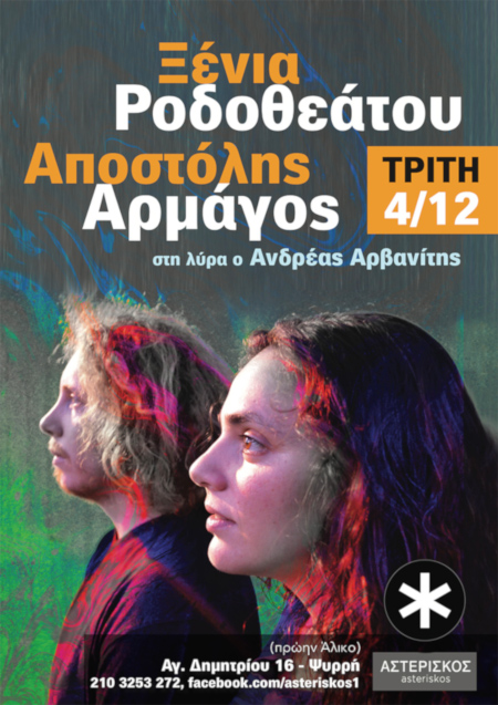 Την Τρίτη 4 Δεκεμβρίου η νέα ερμηνεύτρια Ξένια Ροδοθεάτου και ο συνθέτης Αποστόλης Αρμάγος ανεβαίνουν μετά από 3 χρόνια ξανά μαζί στη σκηνή για ένα μοναδικό live στον φιλόξενο χώρο του Αστερίσκου (πρώην ¶λικο).