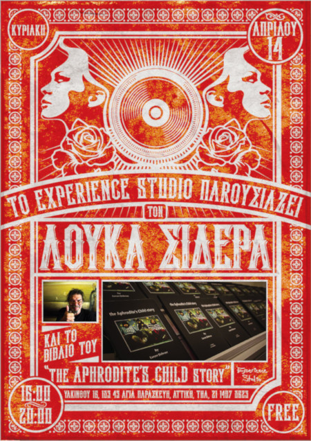 Κυριακή, 14 Απριλίου 2019, 16:00 - 20:00, το Experience Studio θα παρουσιάσει τον Λουκά Σιδερά (Lucas Sideras) και το βιβλίο του "The Aphrodite's Child story", το οποίο μας ταξιδεύει σε εκείνα τα χρόνια που το μεγαλύτερο Ελληνικό Συγκρότημα έγραφε μουσική ιστορία. Ο Λουκάς Σιδεράς θα είναι στην διάθεσή σας για ερωτήσεις, υπογραφές και αναμνηστικές φωτογραφίες.