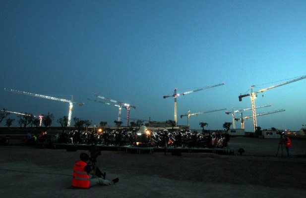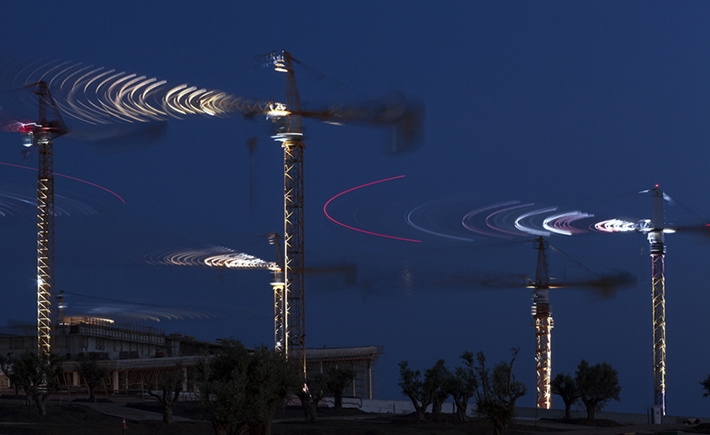 Κατασκευαστικοί γερανοί σε ρόλο χορευτή στο εργοτάξιο του Κέντρου Πολιτισμού.