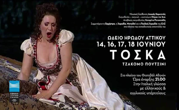 Η σπαρακτική Τόσκα του Τζάκομο Πουτσίνι, μια από τις δημοφιλέστερες όπερες όλων των εποχών, θα παρουσιαστεί από την Εθνική Λυρική Σκηνή στις 14, 16, 17, 18 Ιουνίου 2015 στο Ωδείο Ηρώδου του Αττικού, στο πλαίσιο του Φεστιβάλ Αθηνών. Μια μεγαλειώδης παραγωγή σε μουσική διεύθυνση Λουκά Καρυτινού, με εντυπωσιακά σκηνικά και κοστούμια, τα οποία υπογράφει, μαζί με την σκηνοθεσία, ο διακεκριμένος Αργεντινός σκηνοθέτης Ούγκο ντε Άνα. Πρωταγωνιστούν κορυφαίοι Έλληνες και ξένοι Μονωδοί.