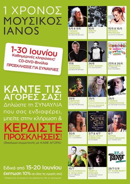 Από τη Δευτέρα 1 Ιουνίου έως και την Τρίτη 30 Ιουνίου, στο κατάστημα θα γίνονται καθημερινά κληρώσεις, με δικαίωμα πολλαπλής συμμετοχής για τους πελάτες, με κάθε αγορά που πραγματοποιείται στο κατάστημα. Και στο τέλος κάθε ημέρας θα γίνεται η κλήρωση και θα μοιράζονται τα δώρα στους πελάτες μας. CD, Βινύλια, DVD αλλά και προκλήσεις για συναυλίες και φεστιβάλ.