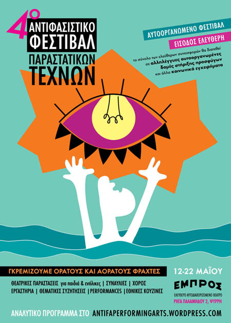 Όταν τα σύνορα κλείνουν, όταν οι φράχτες υψώνονται, όταν το ρεύμα κόβεται και η τέχνη φιμώνεται, εμείς ανατρέποντας τα δεδομένα, ανάβουμε ξανά τα φώτα στη σκηνή. 4ο Αντιφασιστικό Φεστιβάλ Παραστατικών Τεχνών. 11 μέρες γεμάτες με παραστάσεις και εργαστήρια για ενήλικες και παιδιά, προβολές, θεματικές συζητήσεις, συναυλίες, εθνικές κουζίνες. 12 με 22 Μαΐου στο Ελεύθερο Αυτοδιαχειριζόμενο Θέατρο Εμπρός γκρεμίζουμε ορατούς κι αόρατους φράχτες. Τα έσοδα του φεστιβάλ θα διατεθούν σε αυτοοργανωμένες αλληλέγγυες δομές υποδοχής προσφύγων και άλλα κοινωνικά εγχειρήματα.