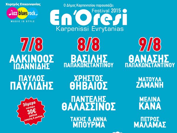 Το «En’Oresi» festival θα διεξαχθεί φέτος στις 7, 8 & 9 Αυγούστου στο Αθλητικό Κέντρο Καρπενησίου. Πλέον μετρά 5 επιτυχημένα χρόνια ζωής αφού ήδη από το ξεκίνημά του, το 2011, έγινε θεσμός στα συναυλιακά δρώμενα της Στερεάς Ελλάδας.