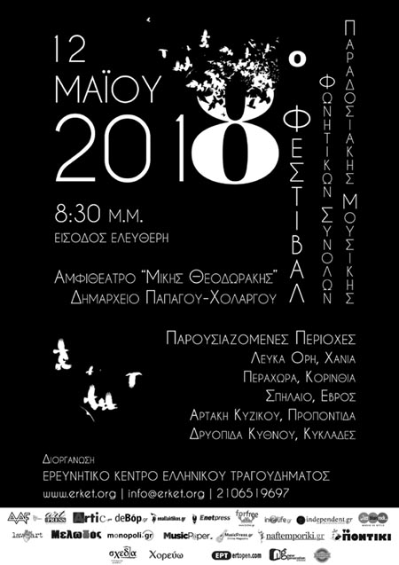 Το Ερευνητικό Κέντρο Ελληνικού Τραγουδήματος [ΕΡ.Κ.Ε.Τ.] ανακοινώνει τη διοργάνωση του 8ουΦεστιβάλ Φωνητικών Συνόλων Ελληνικής Παραδοσιακής & Λαϊκής Μουσικής. Το Φεστιβάλ θα διεξαχθεί το Σάββατο 12 Μαΐου 2018, και ώρα 8:30 μ.μ., στο Αμφιθέατρο «Μίκης Θεοδωράκης» στο Δημαρχείο Παπάγου-Χολαργού, επί της Λεωφόρου Περικλέους 55, 15561 στο Χολαργό.