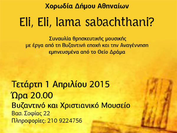 O Οργανισμός Πολιτισμού, Αθλητισμού και Νεολαίας του Δήμου Αθηναίων στο πλαίσιο των εκδηλώσεών του «Πάσχα στην Αθήνα 2015» παρουσιάζει την Χορωδία του Δήμου Αθηναίων στη συναυλία “Eli, Eli, lama sabachthaniΆ” την Τετάρτη 1 Απριλίου στις 8μ.μ. στο Βυζαντινό και Χριστιανικό Μουσείο.