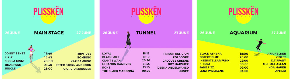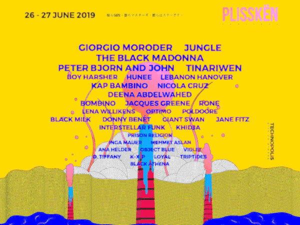 Headliners στο φετινό Plisskën θα είναι ο «πατέρας» της Disco και πρωτοπόρος της ηλεκτρονικής μουσικής Giorgio Moroder, η δημοφιλής modern soul κολεκτίβα των Jungle, οι εκπληκτικοί Τουαρέγκ μουσικοί από τη Σαχάρα, Tinariwen αλλά και η underground super star της house σκηνής, The Black Madonna.