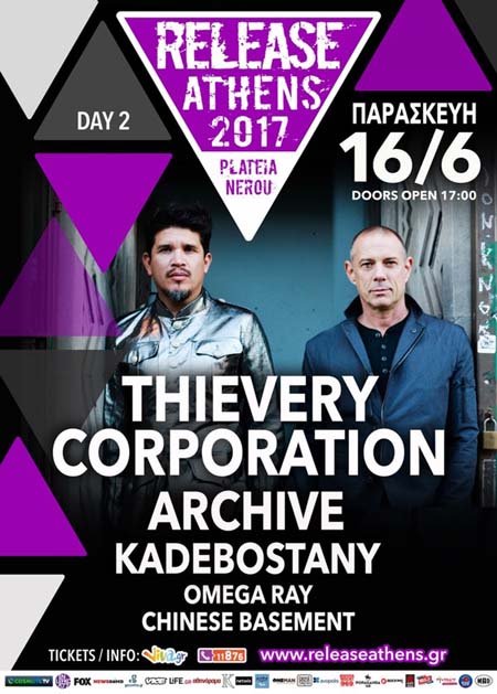 Την Παρασκευή 16 Ιουνίου, το Release Athens 2017 υποδέχεται όλες και όλους εσάς, για τελευταία φορά το φετινό καλοκαίρι, σε μία σπουδαία ημέρα με ορισμένα από τα πλέον αγαπημένα ονόματα του ελληνικού κοινού: Thievery Corporation, Archive, Kadebostany, Omega Ray, Chinese Basement!