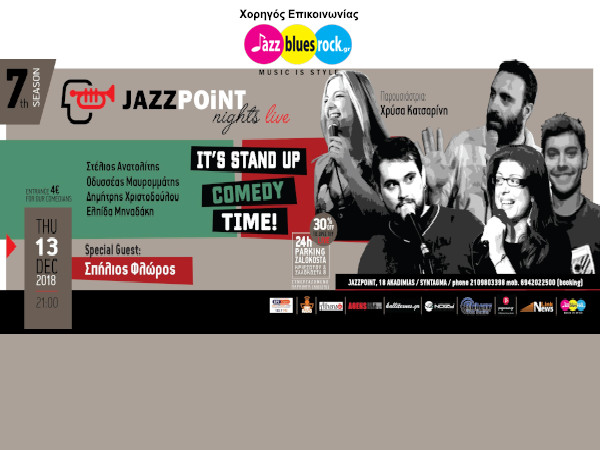 Για άλλη μια σεζόν, το Jazzpoint επανέρχεται για να σας χαρίσει βραδιές γέλιου. Μια Πέμπτη το μήνα, ενώνει τις δυνάμεις του με τους καλύτερους κωμικούς του Stand up Comedy και σας φτιάχνουν τη διάθεση!