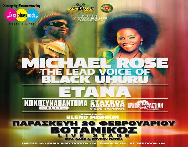 Η προγραμματισμένη συναυλία των Michael Rose & Etana (Βοτανικός 20/2/2015) αναβάλλεται για τεχνικούς λόγους. Η νέα ημερομηνία θα ανακοινωθεί σύντομα. Η διοργανώτρια εταιρία βρίσκεται σε συνεχή επικοινωνία με το Management των καλλιτεχνών. Θα επανέλθουμε άμεσα για τις λεπτομέρειες της νέας ημερομηνίας και των χρηστικών οδηγιών για τους Κατόχους των εισιτηρίων. Ευχαριστούμε για την κατανόηση.