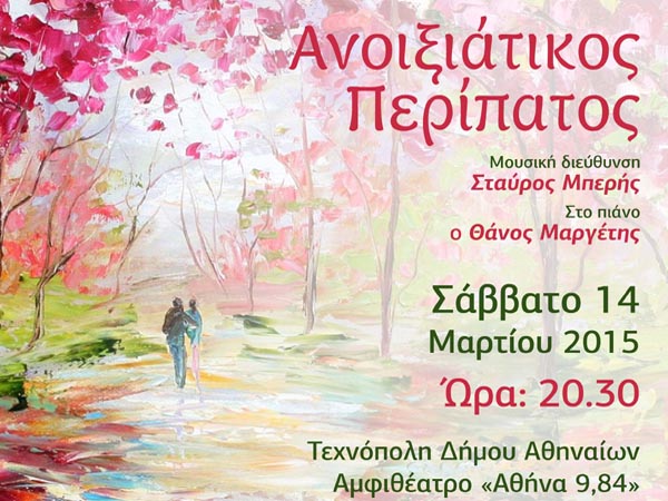Ο Οργανισμός Πολιτισμού, Αθλητισμού και Νεολαίας του Δήμου Αθηναίων υποδέχεται την άνοιξη με τη συναυλία της Χορωδίας «Ανοιξιάτικος Περίπατος» το Σάββατο 14 Μαρτίου στις 8.30μ.μ. στο Αμφιθέατρο του «Αθήνα 9.84» της Τεχνόπολης του Δήμου Αθηναίων και καλεί το κοινό να απολαύσει μία μοναδική μουσική βραδιά εμπνευσμένη από τη Ρομαντική εποχή της κλασικής μουσικής.