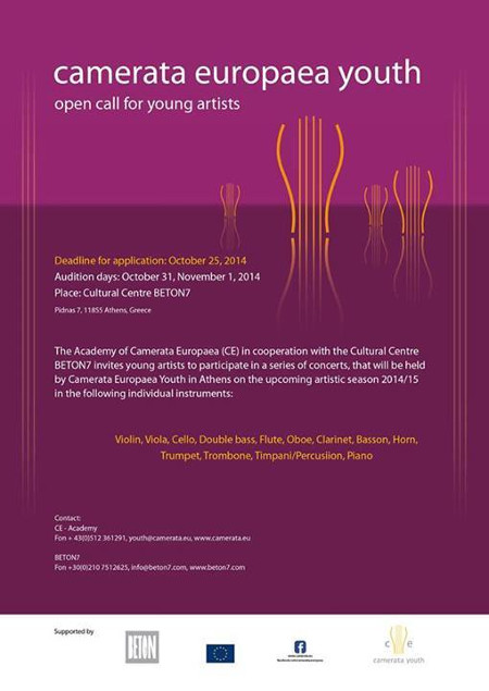 Η Camerata Europaea youth, σε συνεργασία με το Beton7 προσκαλεί νέους καλλιτέχνες (όριο ηλικίας μεταξύ 18 και 35 ετών) να συμμετάσχουν σε μια σειρά από συναυλίες, που θα πραγματοποιηθεί από την Camerata Europaea youth στην επερχόμενη καλλιτεχνική περίοδο 2014/2015 στην Αθήνα. Οι στόχοι της Camerata Europaea youth είναι η προώθηση νέων ταλαντούχων μουσικών σε όλες τις μουσικές και τεχνικές πτυχές, στο πλαίσιο των διαφόρων έργων και προγραμμάτων, όπως: