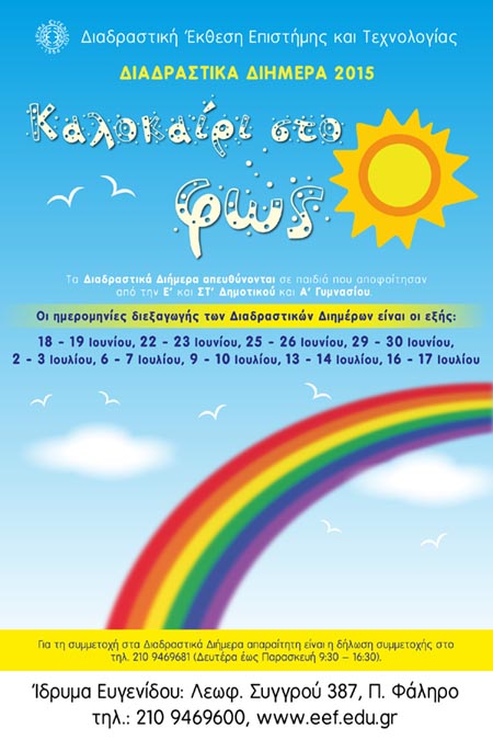 Το 2015 είναι το Διεθνές Έτος Φωτός! Αυτό το καλοκαίρι στα Διαδραστικά Διήμερα θα «ρίξουμε άπλετο φως» στα βασικά χαρακτηριστικά και στις ιδιότητές του! Παράλληλα, θα αναρωτηθούμε γιατί βλέπουμε χρώματα και τι συμβαίνει όταν μας ξεγελούν τα μάτια μας! Μέσα από πειράματα, εργαστήρια, παιχνίδια και κατασκευές θα αναζητήσουμε όλα τα στοιχεία που κάνουν το φως τόσο ξεχωριστό για τη ζωή μας. Την δεύτερη ημέρα, στην τελετή λήξης, οι γονείς θα παρακολουθήσουν έναν πρωτότυπο διαγωνισμό στον οποίο τα παιδιά καλούνται να συμπεριφερθούν όπως το φως!