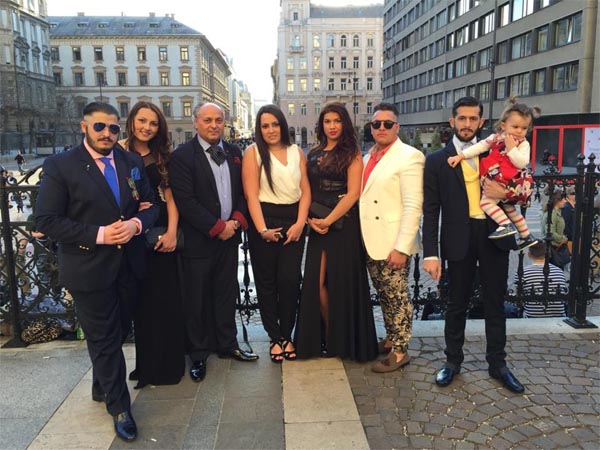Lajos Sárközi Junior σε οικογενειακή φωτογραφία (απεικονίζεται στην άκρη αριστερά, έχοντας δίπλα τη μνηστή του και δεξιότερα τον μέντορα πατέρα του και ηγετικό μέλος της Gypsy Philharmonic Orchestra, Lajos Sárközi Senior.