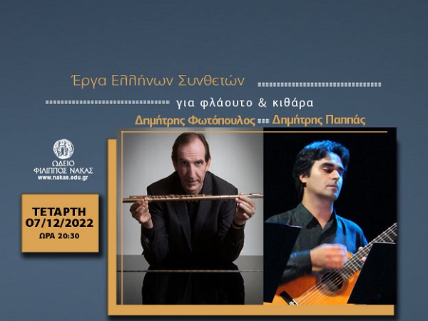 Ο φλαουτίστας Δημήτρης Φωτόπουλος και ο κιθαριστής Δημήτρης Παππάς παρουσιάζουν τα «Έργα Ελλήνων Συνθετών για Φλάουτο Κιθάρα / σόλο Φλάουτο - σόλο Κιθάρα» την Τετάρτη 7 Δεκεμβρίου, στις 8.30 μ.μ. στην Αίθουσα Συναυλιών Φίλιππος Νάκας. Είναι μία παρουσίαση στο κοινό, έργων που δημιουργήθηκαν από τη δεκαετία του 60 μέχρι σήμερα. Μία συναυλία που είναι πράξη προβολής και ανάδειξης της σημαντικής τους δημιουργίας και παράλληλα ένας φόρος τιμής στους εκλιπόντες δημιουργούς. Βαθιά υποχρέωση που έχουμε απέναντί τους όλοι οι Έλληνες ερμηνευτές.