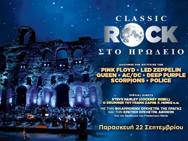 Μια από τις μεγαλύτερες ορχήστρες της Ευρώπης, η Φιλαρμονική Ορχήστρα της Πράγας, παρουσιάζει τη συναυλία με την οποία η ροκ μουσική μπόρεσε να εισχωρήσει και να ακουστεί σε όλες τις μεγάλες όπερες της Ευρώπης. Classic Rock! Διάσημα τραγούδια των μεγαλύτερων ροκ συγκροτημάτων παρουσιάζονται με συμφωνικό ήχο, μαζί με ηλεκτρικά όργανα! Ειδικά για τη συναυλία που θα πραγματοποιηθεί στο Ηρώδειο, εξασφαλίστηκε η σπουδαία σύμπραξη της Φιλαρμονικής της Πράγας με την Κρατική Ορχήστρα Αθηνών. Την Πέμπτη 21 και την Παρασκευή 22 Σεπτεμβρίου καταξιωμένοι καλλιτέχνες, ο καθένας στο δικό του ύφος, σμίγουν μουσικά επί σκηνής και μας προσκαλούν να ζήσουμε την εμπειρία. Οι μεγαλύτερες επιτυχίες των Pink Floyd, Rolling Stones, Led Zeppelin, Queen, AC/DC, Deep Purple, Scorpions και Police, θα ακουστούν από τους σπουδαίους μουσικούς της Φιλαρμονικής Ορχήστρας της Πράγας και της Κρατικής Ορχήστρας Αθηνών, αλλά και από διάσημους προσκεκλημένους, υπό τη μουσική διεύθυνση του μαέστρου, συνθέτη και ενορχηστρωτή Friedemann Riehle.