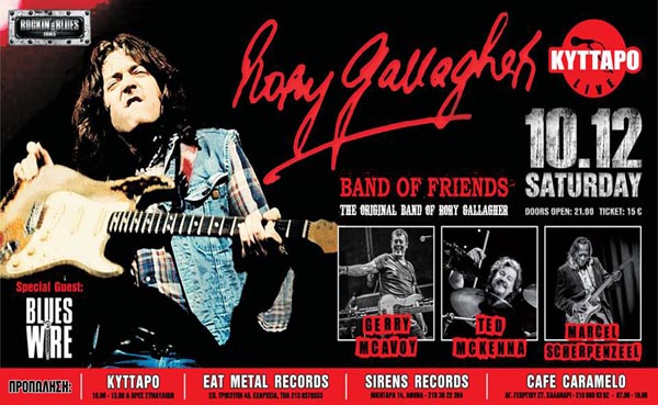 Οι BAND OF FRIENDS… (για τους λίγους πλέον που δεν γνωρίζουν για ποιούς μιλάμε..) Bio: GERRY McAVOY (Bass) Ο πλέον αναγνωρισμένος συμπαίκτης και φίλος του του Rory παρών σε όλες τις ηχογραφήσεις, σε όλες τις περιοδείες, σε όλα τα άλμπουμ του από το 1971 έως το 1991 (και φυσικά παρών στο liveσταθμό στη Ν. Φιλαδέλφεια το 1981) !!!!! TED McKENNA (Drums) Μυθικός ντράμερ με τεραστία καριέρα στην αφρόκρεμα της παγκόσμιας μουσικής σκηνής έχοντας πρωταγωνιστήσει μεταξύ άλλων με τους The Sensational Alex Harvey Band, Greg Lake - ELP, Gary Moore, Michael Schenker και Ian Gillan - Deep Purple!!!! Ηχογράφησε και παρουσίασε με τον Rory τα: «Photo Finish», «Top Priority» and «Stage Struck». MARCEL SCHERPENZEEL (Guitar/Vocals) Έχοντας μεγαλώσει με τη μουσική του Rory, άφησε πίσω την προσωπική του καριέρα και μπάντα (Marcel Scherpenzeel Band και Wolfpin) για να ζήσει στο μύθο του μεγάλου του ειδώλου και εν τέλει να κερδίσει το παράσημο του Gerry McAvoy, "This is the closest guitarist to Rory you will ever hear" αλλά και την κοινή αποδοχή σε ένα τόσο απαιτητικό ρόλο!! …συναντάνε για πρώτη φορά στη σκηνή, την κατά πολλούς καλύτερη blues μπάντα της Ευρώπης, τους BLUES WIRE... Bio: «Οι Μπλουζ Γουαιρ ειναι το καλύτερο συγκρότημα του είδους στην Ευρώπη. Τους αξίζει ν’ ακουστούν στα μεγαλύτερα ακροατήρια» KATIE WEBSTER Μια μπάντα φαινόμενο για την Ελληνική πραγματικότητα, πρωτεργάτες του μπλουζ στη χώρα μας με πλειάδα διακρίσεων εντός και εκτός των τειχών, 30 χρόνια πορείας, πανω απο 10+ δισκάρες στο ενεργητικό τους, συνεργασίες με κορυφαία ονόματα του είδους (John Hammond/ Louisiana Red/ Katie Webster/ Carey Bell / Dave Kelly/ Angela Brown/ Larry Garner/ Dick Heckstall Smith/ Al Copley/ Guitar Shorty/ Johnny Mars/Dr.FEELGOOD κ.α Opening acts σε.. Buddy Guy, Albert King, John Mayall, Otis Rush κ.α και συμμετοχές σε μεγάλα ευρωπαικά φεστιβάλ, μα πάνω απ’ όλα μια μπάντα βιωματική με θαυμαστή συνέπεια και αφοσίωση αλλά και το μοναδικό ταλέντο που τους επέτρεψε να ξεχωρίσουν και εν τέλει να καθορίσουν τα αγαπημένα τους μπλουζ... ...και στήνουν μια ζωντανή τετράωρη πανδαισία με φόντο τις τραγουδάρες του Rory και τη Rhythm n Blues φιλοσοφία σε ένα Saturday Night Special (μην είναι και Sunday Morning…) «τζαμάρισμα» μέχρι τελικής πτώσης . -