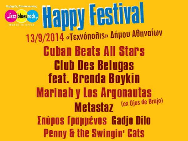 Το Σάββατο 13 Σεπτεμβρίου διοργανώνεται το HAPPY FESTIVAL, το πολύ μεγάλο world music festival στην "Τεχνόπολις" του Δήμου Αθηναίων με ένα line up που θα ζήλευαν και τα καλύτερα World Music Festival σε ολόκληρη την Ευρώπη για το 2014!