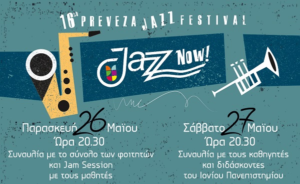 Με συναυλίες κάθε βράδυ στις 20.30 στο Πολιτιστικό Κέντρο Δήμου Πρέβεζας (πρώην ΟΑΣΗ) και με ελεύθερη είσοδο για το κοινό ολοκληρώνεται το JAZZ NOW!, το διήμερο γνωριμίας με τη τζαζ για νέους μουσικούς από τους καθηγητές και τους διδάσκοντες του Ιονίου Πανεπιστημίου με συντονισμό του Δήμου Δημητριάδη. Το Σάββατο 26 Μάιου ολοκληρώνεται η διδασκαλία της πρώτης μέρας με ένα Jam Session με τους συμμετέχοντες στα εργαστήρια οργάνων και συναυλία με το σύνολο των φοιτητών του Ιονίου Πανεπιστημίου. Την Κυριακή 27 Μάιου το διήμερο κλείνει με συναυλία των καθηγητών και διδασκόντων του Ιονίου Πανεπιστημίου. Το “Jazz Now!" υλοποιείται με αποκλειστική δωρεά του Ιδρύματος Σταύρος Νιάρχος στο Preveza Jazz Festival.