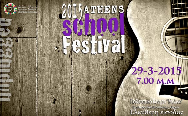 Την Κυριακή 29 Μαρτίου στις 7μ.μ. το Πολιτιστικό Κέντρο Δήμου Αθηναίων «Μελίνα» φιλοξενεί τα μαθητικά συγκροτήματα του 7ου Athens School Festival σε μία unplugged συναυλία.