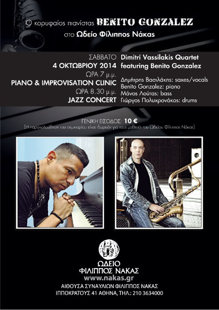 To Σάββατο 4 Οκτωβρίου, στις 7 το βράδυ, ο superstar Νεοϋρκέζος μουσικός Benito Gonzalez θα διδάξει σε σεμινάριο jazz πιάνου και αυτοσχεδιασμού στο Ωδείο Φίλιππος Νάκας. Ο Gonzalez θα αναφερθεί ιστορικά σε όλα τα στιλ jazz piano από Fats Waller μέχρι Herbie Hancock μέσα από τις συνεργασίες του με μεγάλους μουσικούς της τζαζ όπως Jackie MacLean, Kenny Garrett, Roy Hargrove, Steve Turre, Nickolas Payton, Curtis Fuller, Pharaoh Sanders, Bobby Hutcherson, Delfayo Marsalis κ.ά. Επίσης στη δική του πορεία από τη Βενεζουέλα στη Νέα Υόρκη και στις μεγαλύτερες σκηνές του κόσμου. Ευπρόσδεκτοι στο σεμινάριο είναι σπουδαστές όλων των οργάνων, καθώς θα έχει τη μορφή εργαστηρίου και ο Gonzalez θα συμπράξει επί σκηνής με όσους θέλουν να αυτοσχεδιάσουν μαζί του. Οι συμβουλές ενός session μουσικού της εμβέλειας του Gonzalez είναι εξαιρετικά πολύτιμες για κάθε σπουδαστή.