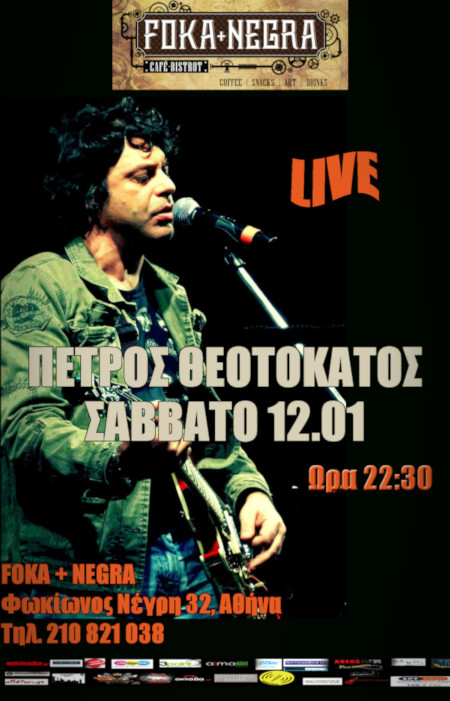 Εικοσι χρόνια από το θρυλικό πια «Πιστόλι στο Πιάτο», ο δημιουργός του αγαπημένου «Θα χαθώ», Πέτρος Θεοτοκάτος, θα εμφανιστεί το Σάββατο, 12 Ιανουαρίου, στο “FOKA + NEGRA» στην Κυψέλη, σε μια ηλεκτροακουστική μουσική βραδιά, για να μας ταξιδέψει στη δική του προσωπικήτραγουδοποιία, αλλά και σε ανατρεπτικές διασκευές από την ελληνική και ξένη ροκ σκηνή..