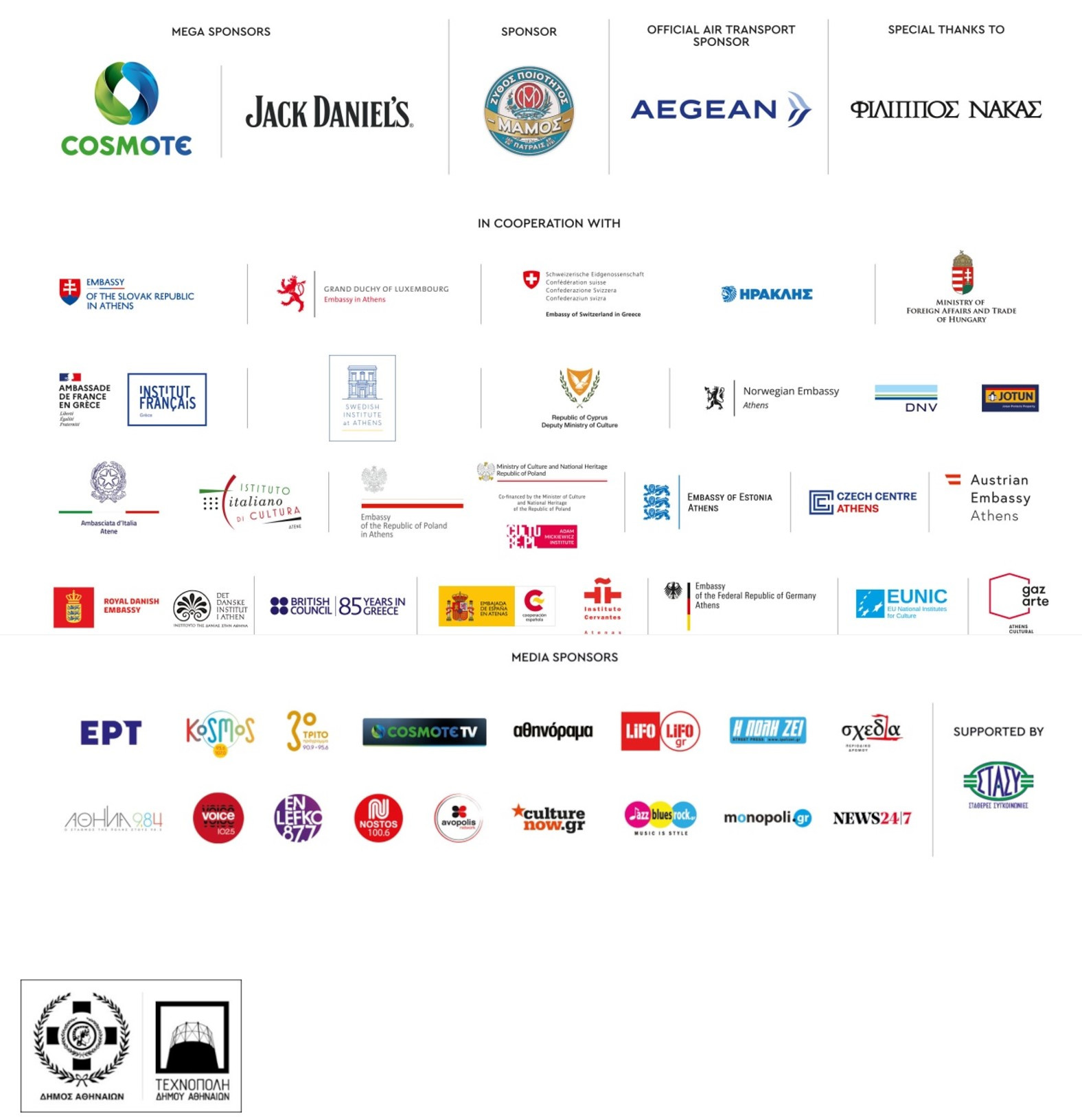 Το 23ο Athens Jazz πραγματοποιείται με Μεγάλους Χορηγούς την COSMOTE και το Jack Daniel’s, Χορηγό την Αθηναϊκή Ζυθοποιία, Επίσημο Χορηγό Αερομεταφορών την AEGEAN και με την ευγενική χορηγία των καταστημάτων Φίλιππος Νάκας.