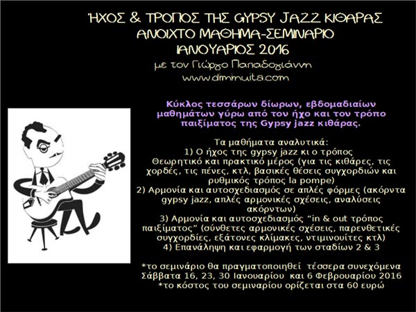 Κύκλος τεσσάρων δίωρων, εβδομαδιαίων μαθημάτων γύρω από τον ήχο και τον τρόπο παιξίματος της Gypsy jazz κιθάρας.