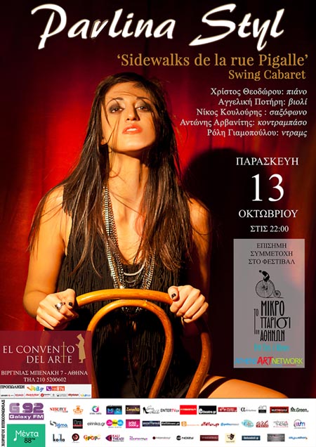 Η περφόρμερ Pavlina Styl με την πενταμελή ορχήστρα της παρουσιάζουν την παράσταση «Sidewalks de la rue Pigalle» στο πλαίσιο του Φεστιβάλ «Μικρό παρίσι των Αθηνών» την Παρασκευή 13 Οκτωβρίου και για ακόμη δύο εμφανίσεις την Πέμπτη 2 Νοεμβρίου και την Παρασκευή 24 Νοεμβρίου, στην μουσική σκηνή του El Convento del Arte. Ένα πρόγραμμα με νέες διασκευές και αγαπημένα κομμάτια του διεθνούς και ελληνικού ρεπερτορίου που είναι βασισμένα κυρίως στο μουσικό θέατρο και το καμπαρέ.