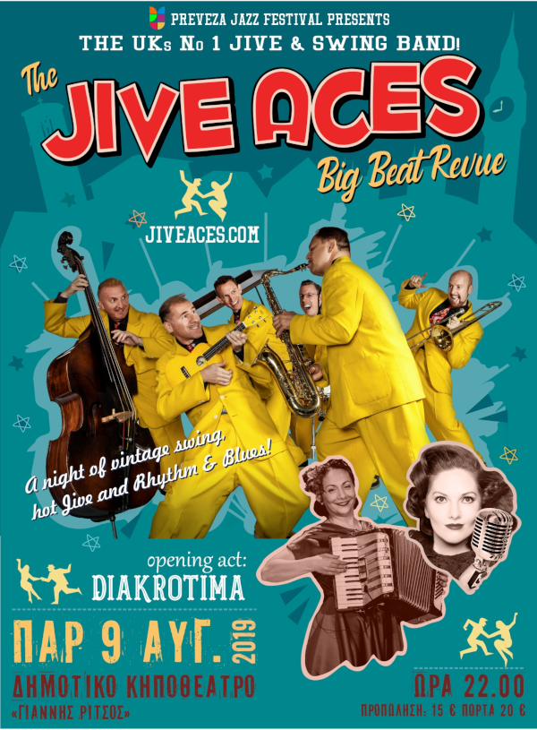Οι Jive Aces το 8μελές συγκρότημα με την πιο feelgood διάθεση έρχεται από το Λονδίνο για να ξετυλίξει το soundtrack της ζωής μας και να κάνει αυτό που ξέρει καλύτερα από όλους. Να μας διασκεδάσει με όλες τις μεγάλες και γνώριμες επιτυχίες των δεκαετιών 30’s, 40’s, 50’s kai 60’s σε μοντέρνες ενορχηστρώσεις.
