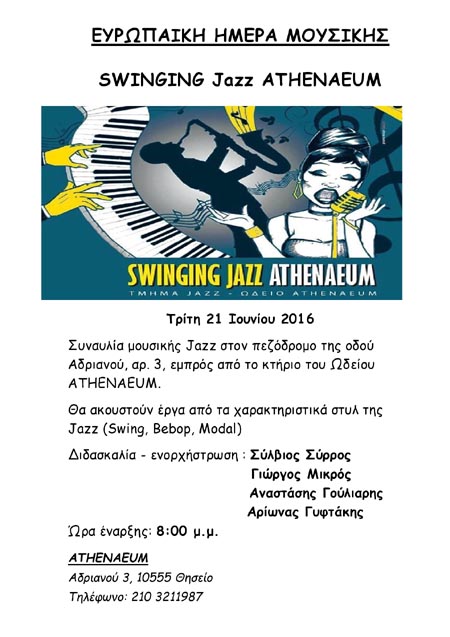 Έτσι, την Τρίτη 21 Ιουνίου 2016, από τις 20:00 έως τις 24:00, το ATHENAEUM μεταμορφώνει τον πεζόδρομο της οδού Αδριανού, εμπρός από το κτήριο του, σε υπαίθρια σκηνή, όπου οι σπουδαστές του τμήματος Jazz του Ωδείου θα παίξουν χαρακτηριστικά ρεύματα της τζαζ μουσικής Swing, Bebop, Modal .