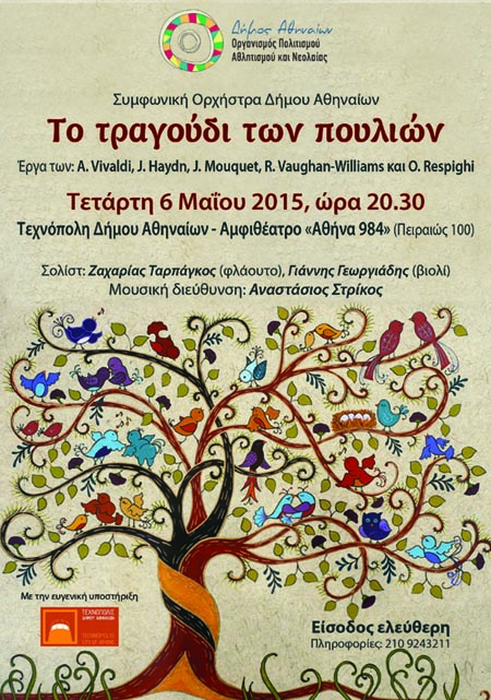 Ο Οργανισμός Πολιτισμού, Αθλητισμού και Νεολαίας του Δήμου Αθηναίων παρουσιάζει, την Τετάρτη 6 Μαΐου στις 8.30μ.μ. στην Τεχνόπολη, τη Συμφωνική Ορχήστρα του Δήμου Αθηναίων σε μία συναυλία εμπνευσμένη από τις μελωδίες της φύσης με τίτλο «Το τραγούδι των πουλιών».