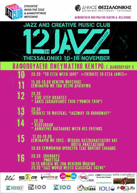 Σας προσκαλούμε στην "12η Γιορτή της Τζαζ" που διοργανώνεται από τον Σύλλογο "Φίλοι της Τζαζ & Δημιουργικής Μουσικής" ("Association of Jazz and Creative Music") υπό την αιγίδα της Αντιδημαρχίας Πολιτισμού Δ/νση Πολιτισμού Τουρισμού.