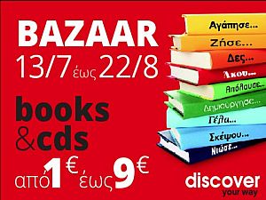 Ένα μοναδικό Βazaar διοργανώνει το βιβλιοπωλείο Discover your Way. Στην καρδιά του καλοκαιριού, δίνει την ευκαιρία σε όσους επιθυμούν να αποκτήσουν βιβλία, CD, DVD σε χαμηλές τιμές...