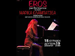 Η Σοπράνο και συνθέτρια της πρωτοποριακής μουσικής σκηνής Μαρίκα Κλαμπατσέα παρουσιάζει την Performance EROS, μια ωδή στον έρωτα, μήνυμα χαράς, δίνοντας φώς σε μια εποχή που όλα φαίνονται θαμπά, απόμακρα, επικίνδυνα, στείρα και απαγορευτικά.